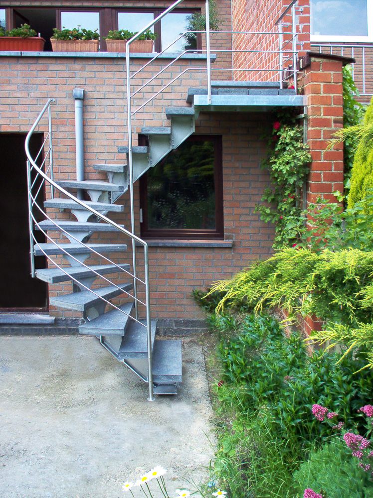 SPIRWILL EXT est un escalier droit ou tournant pour l’extérieur, constitué d’éléments modulaires en aluminium. Il est conçu pour connecter facilement terrasse, balcon, jardin ou étage tout en prenant peu de place au sol. Sa géométrie sobre et linéaire s’intègre aussi bien à une maison contemporaine qu’à une rénovation plus traditionnelle.